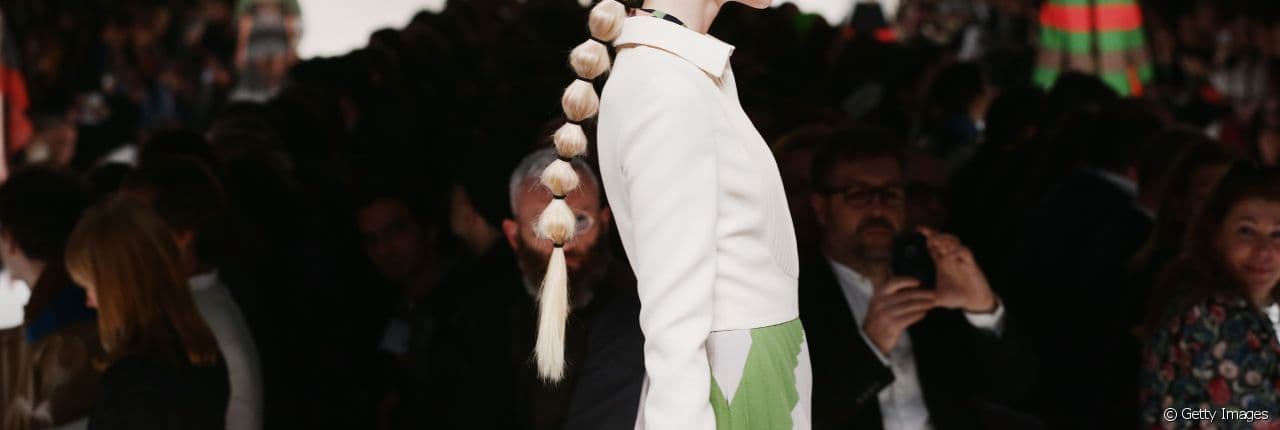 Vue sur le défilé Valentino (ci-dessus), la queue-de-cheval à étages ne nécessite rien de plus que des cheveux longs et plusieurs élastiques. La photo représente parfaitement la coiffure, qui se doit de vous assurer une allure élégante et distinguée. Veillez à parfaitement la réaliser.