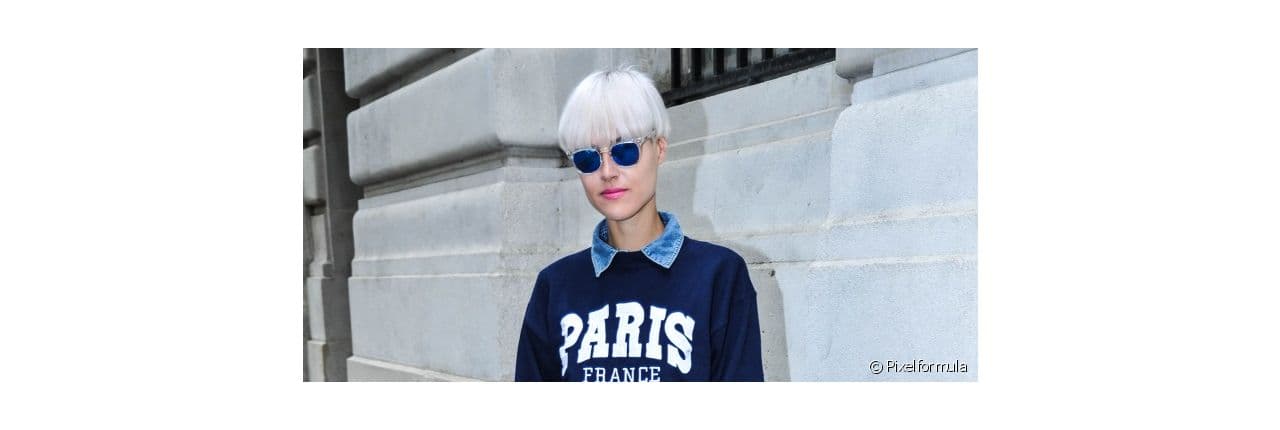 Sa coiffure ? Une coupe au bol sur des cheveux blond polaire. Notre streetstyle du jour, avec ses cheveux fins, a eu envie d’une coupe pleine d’audace pour renforcer son style aussi urbain qu’audacieux. Loin de la coupe au bol que les garçons affichaient à l’école primaire, celle qu’il faut afficher aujourd’hui est plus longue et vous offre la possibilité d’avoir une frange. Pour une coupe au bol sublimée, il faudra la porter avec les extrémités arrondies. Pour cela, travaillez votre chevelure au fer à lisser puis avec une pâte sculptante pour créer cet effet.